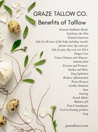 Have you heard of beef tallow? It's got a buzz around it. What is it? How and why does it work? Beef tallow is the fat that forms around a cow's organs. Ancient civilizations such as the Egyptians and Romans utilized tallow for its countless benefits. It continued to be used by settlers, farmers, etc, until the Industrial Revolution. It was then, we started mass producing products for the home and personal use. Convenience became the standard. Along with convenience came chemicals and preservatives that our bodies absorb. Ingredients are causing diseases such as cancer, reproductive and hormonal problems, as well as countless other issues. GRAZE TALLOW CO. only uses 100% Organic grassfed and finished beef tallow. It is vital that only 100% grassfed tallow is used in skincare for it to contain the large amounts of collagen, vitamins A, D, E, and K. as well as countless amino acids and a natural anti-inflammatory called Linolenic Acid. Which treat conditions such as Rosacea. It also clears pores and clears arteries when you cook with it. Why does it work? It's biology - our bodies recognixe all the natural ingredients in GRAZE TALLOW CO.'s products. Therefore, the natural products break through the skin barrier and penetrate the skin, releasing all of the benefits. Large amounts of fat soulable collagen penetrate the skin. Collegen production starts to slow down in our early 30's. It's safe to say we all need it. This is why tallow cream is dubbed "BOTOX IN A JAR".